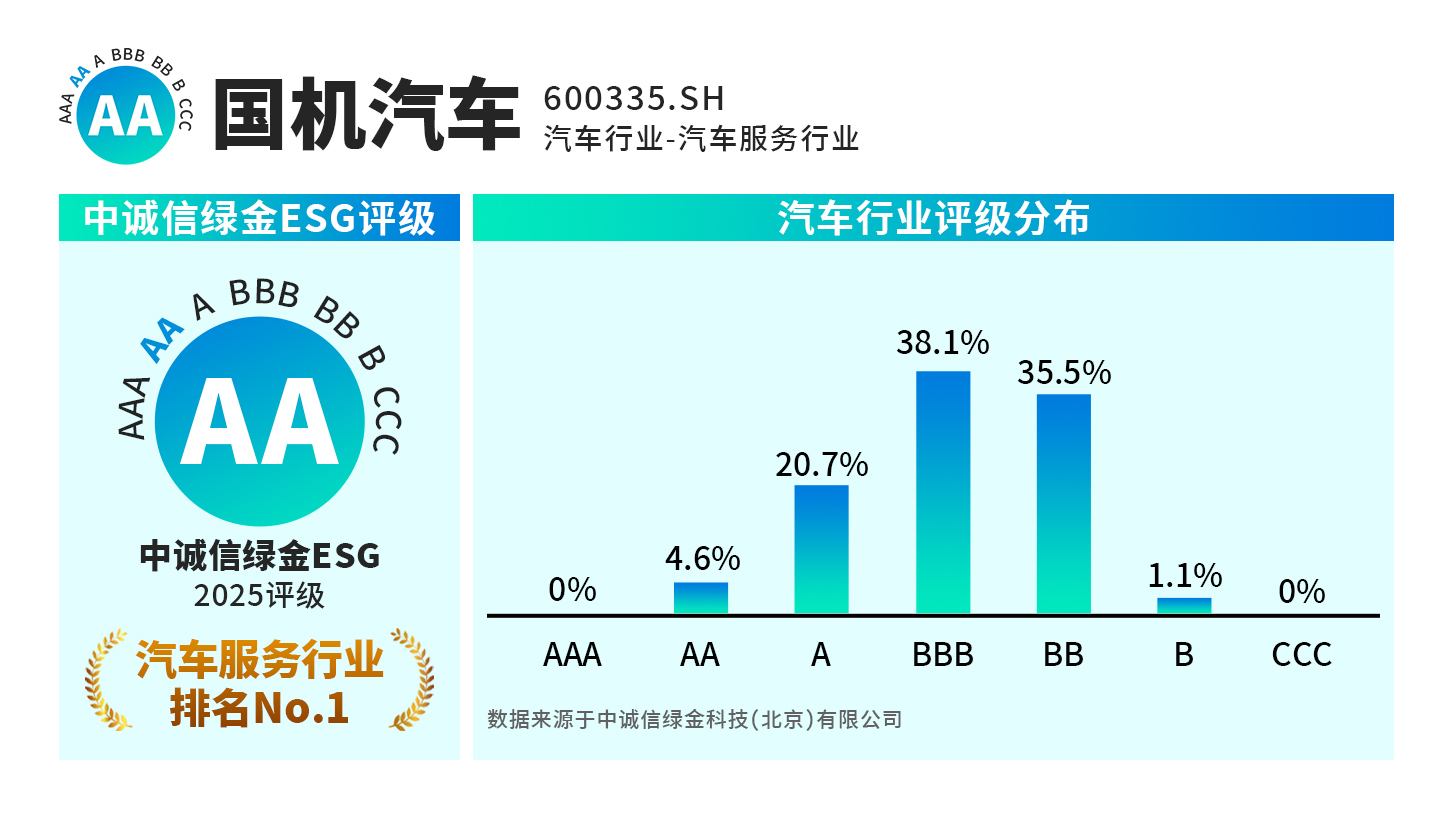 近日,國機(jī)汽車股份有限公司(證券代碼:600335.SH),榮獲所在行業(yè)中誠信綠金ESG最高評(píng)級(jí)AA,躋身上市公司前4%行列,彰顯公司在環(huán)境、社會(huì)和治理(ESG)領(lǐng)域的卓越表現(xiàn)與顯著進(jìn)步。中誠信綠金是中國領(lǐng)先的ESG評(píng)級(jí)機(jī)構(gòu),構(gòu)建了一套深度融合本土實(shí)踐與國際規(guī)范的評(píng)級(jí)體系,其將A...